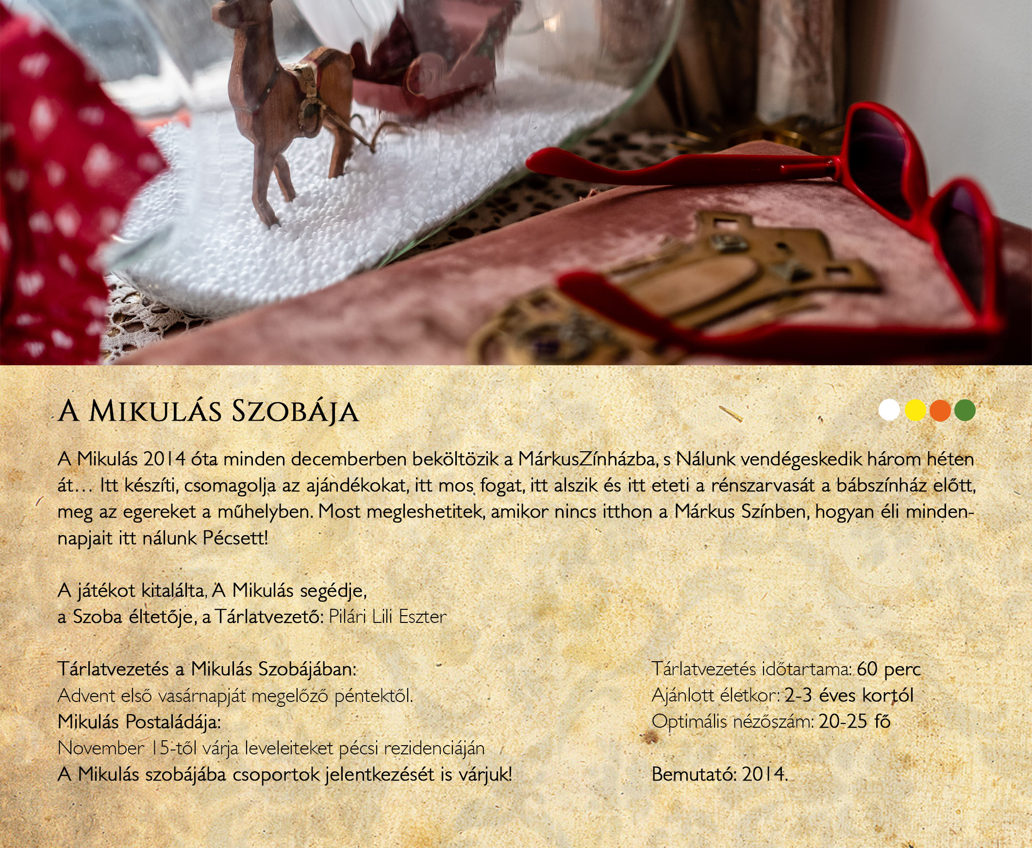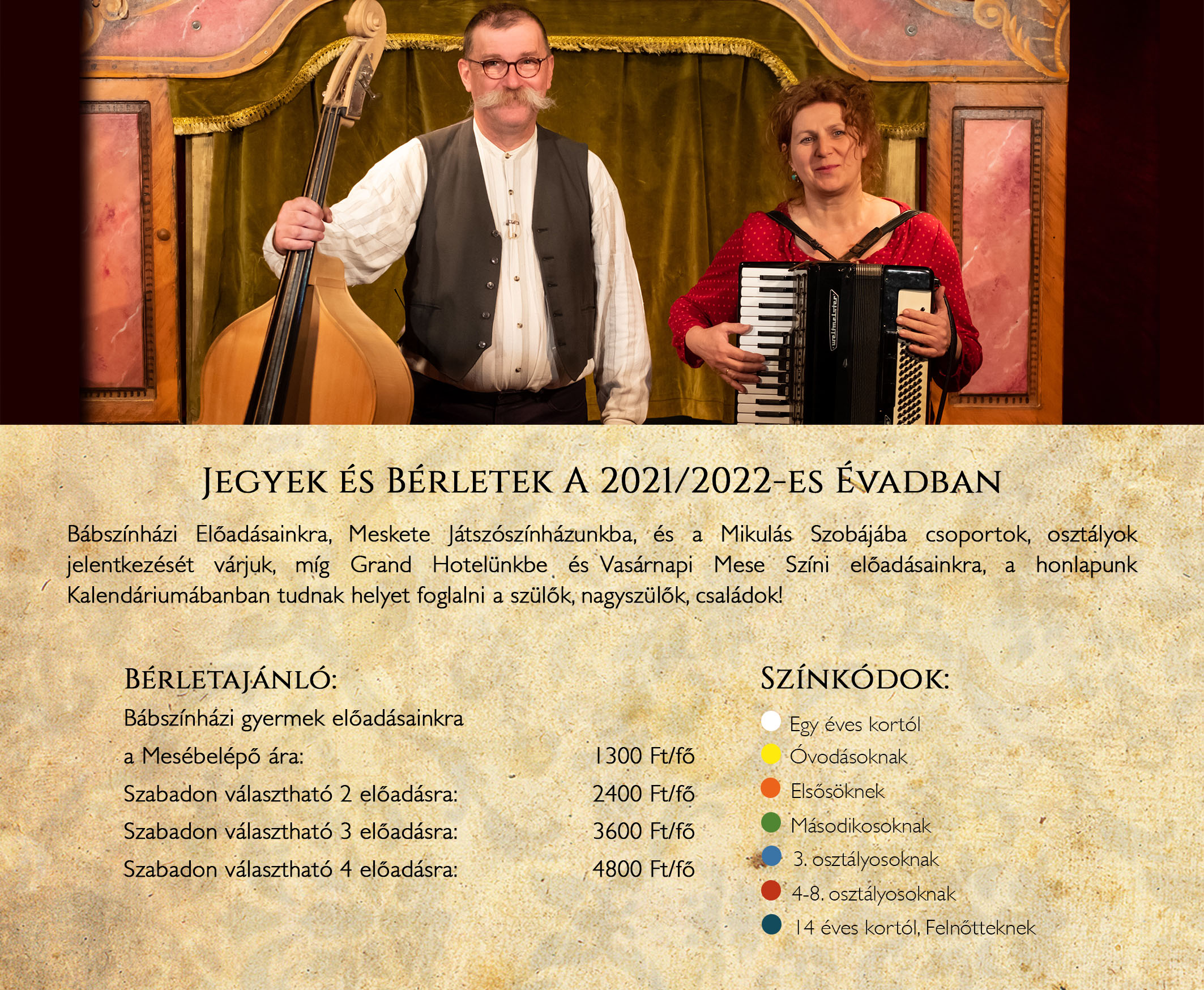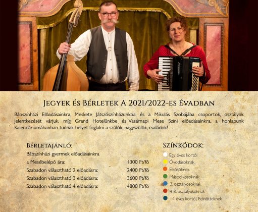 Bábszínházi Előadásainkra, Meskete Játszószínházunkba, és a Mikulás Szobájába csoportok, osztályok jelentkezését várjuk, míg Grand Hotelünkbe és Vasárnapi Mese Színi előadásainkra, a Kalendáriumban tudnak helyet foglalni a szülők, nagyszülők, családok!